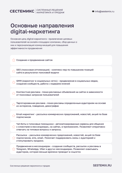 Социальные сети: Использование платформ, таких как Facebook, Instagram и LinkedIn, для продвижения продуктов и услуг, а также создания рекламных кампаний, направленных на целевую аудиторию.